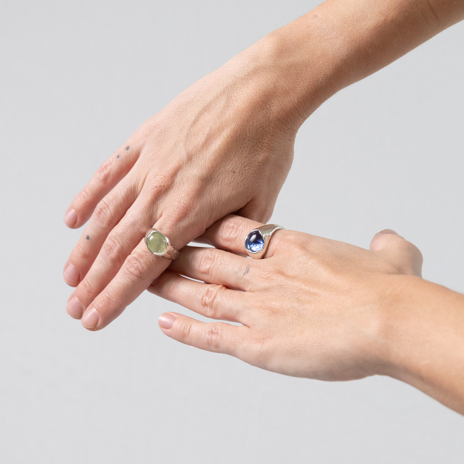 -Teardrop gemstone unisex ring in blue zircon, light blue zircon, Green Prehnite and deep red garnet.
