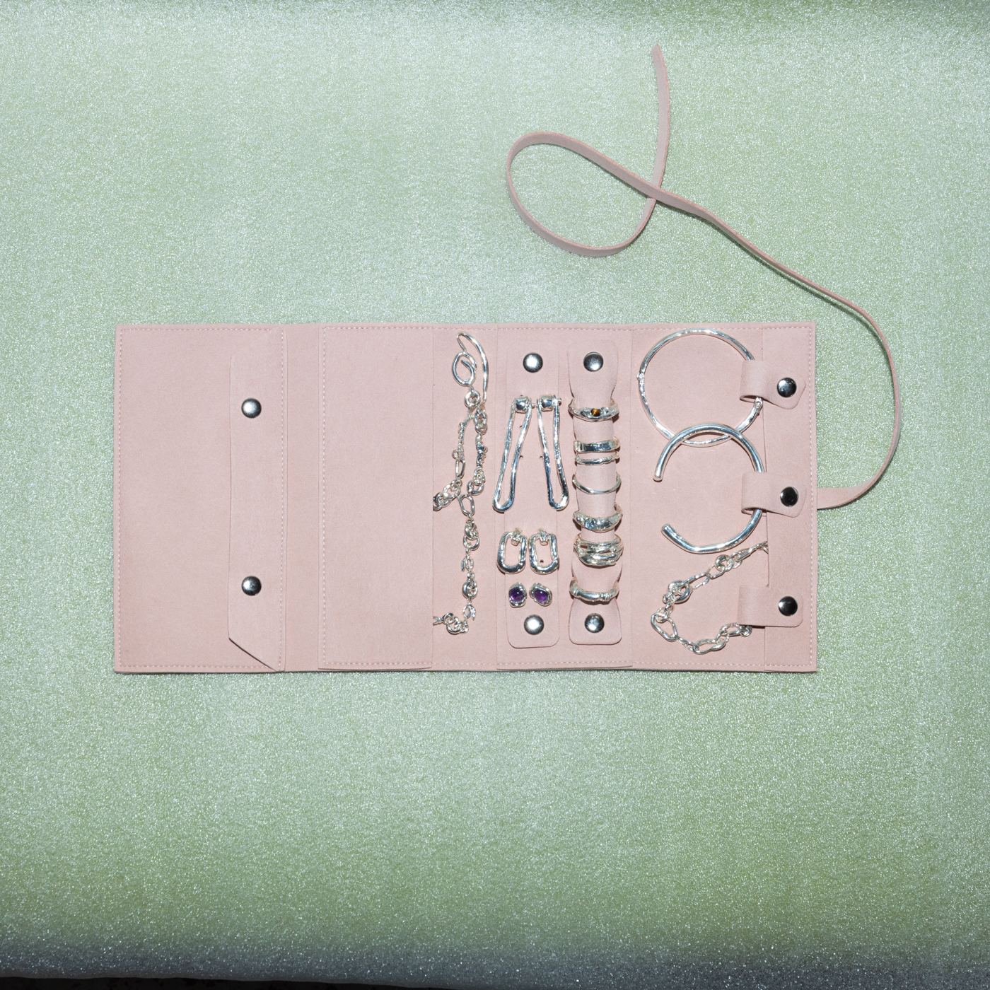 -A jewelry roll pouch suitable for storing your rings, earrings, necklaces and bracelets.